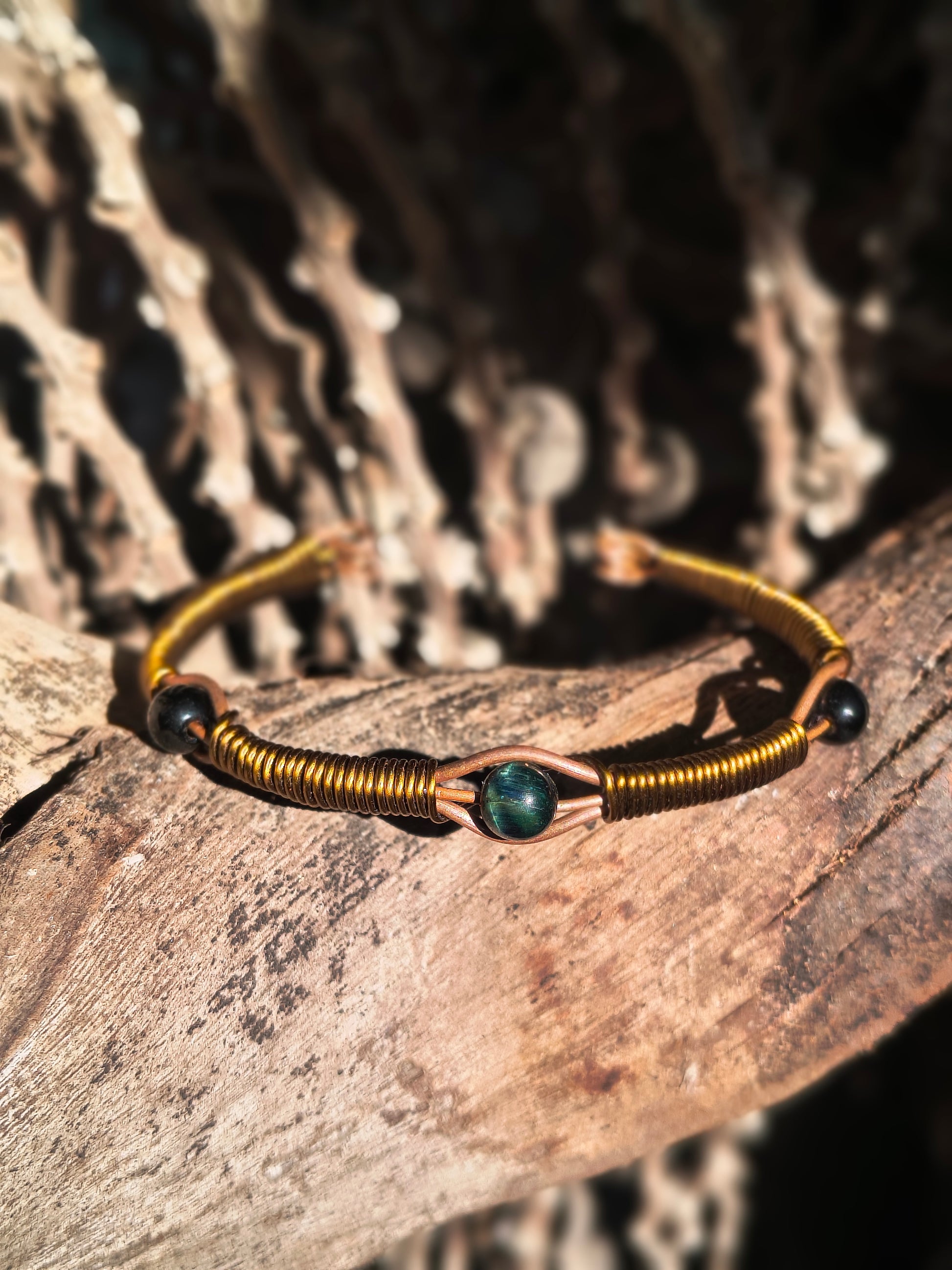 Un refinado brazalete de cobre con un ojo de tigre azul intenso en el centro, acentuado con suaves cuentas de obsidiana y envuelto a mano para crear un diseño equilibrado y con una esencia natural. El cálido brillo del cobre contrasta a la perfección con el cambiante brillo azul de la piedra, mientras que los detalles de alambre en espiral aportan textura y resistencia a esta pieza, tan natural como protectora.