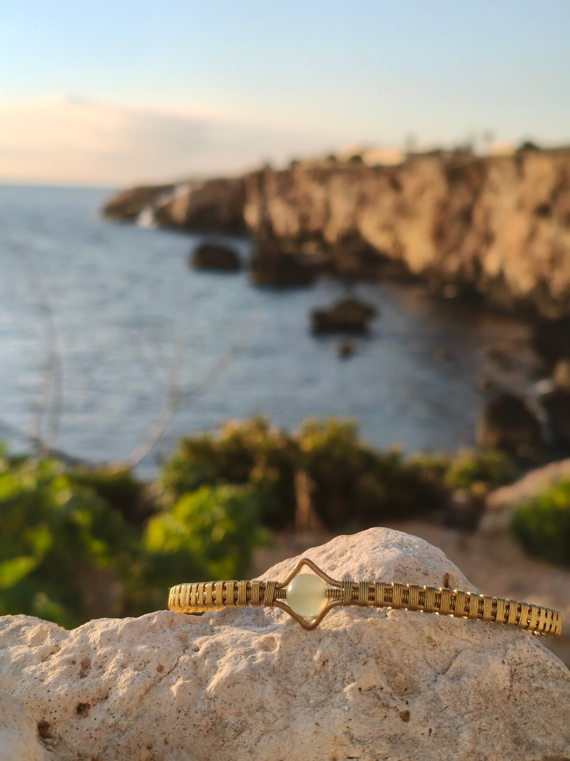 Un luminoso brazalete de latón dorado con una suave aventurina verde en el centro, tejido a mano para crear un diseño limpio y texturizado que transmite elegancia y sosiego. Los cálidos tonos dorados del latón realzan el delicado brillo de la piedra, mientras que su equilibrada estructura le otorga una presencia atemporal y refinada, inspirada en la armonía natural.