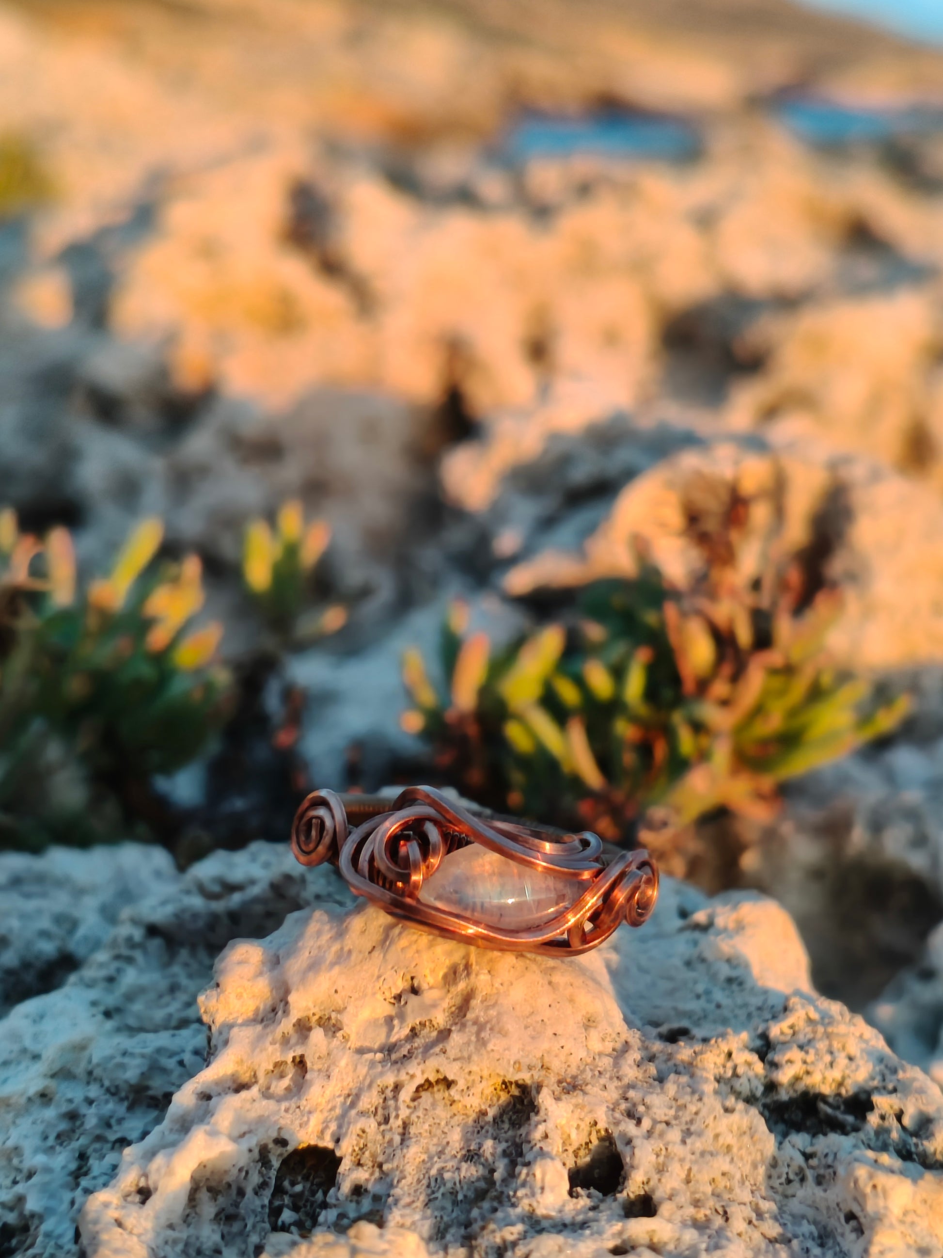 Un luminoso anillo de piedra lunar envuelto en cálido cobre, con suaves curvas y espirales que la sujetan con firmeza, permitiendo que su brillo natural brille. La suave iridiscencia de la piedra lunar se transforma sutilmente con la luz, creando una presencia serena y etérea que evoca la tranquilidad y la ensoñación.
