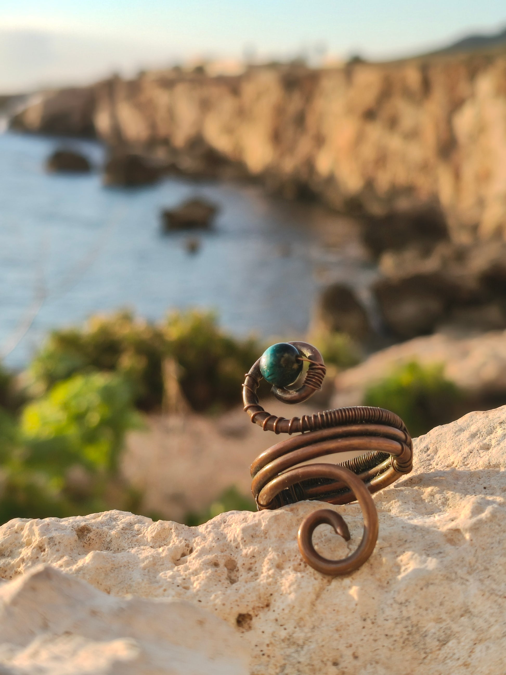 A sculptural blue tiger eye ring handcrafted in warm copper, formed with flowing coils that create movement and an organic, wave-like silhouette. The deep blue stone sits at the crest of the design, catching subtle flashes of light that echo the shifting tones of sea and sky.