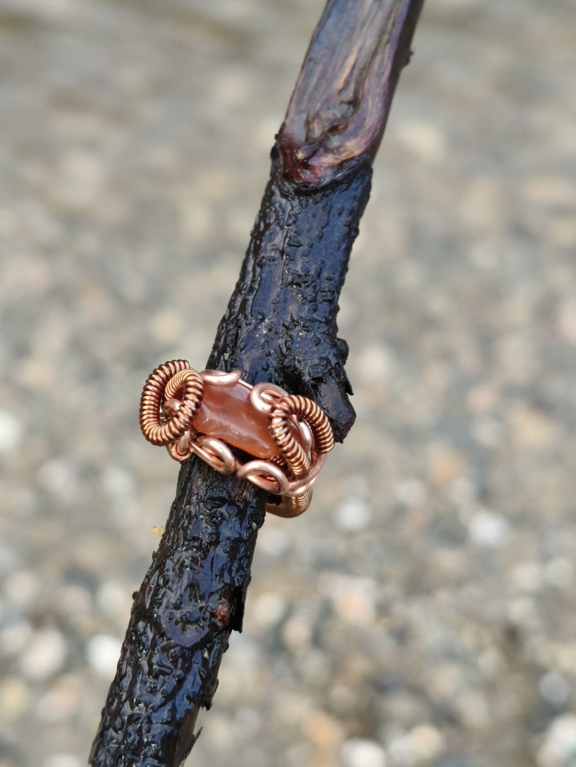 Un vibrante fragmento de cornalina se encuentra en el centro de este cálido anillo de cobre, sostenido por detalladas espirales y líneas fluidas. El alambre forma un marco protector alrededor de la piedra, lo que le otorga a la pieza un carácter audaz y escultural.