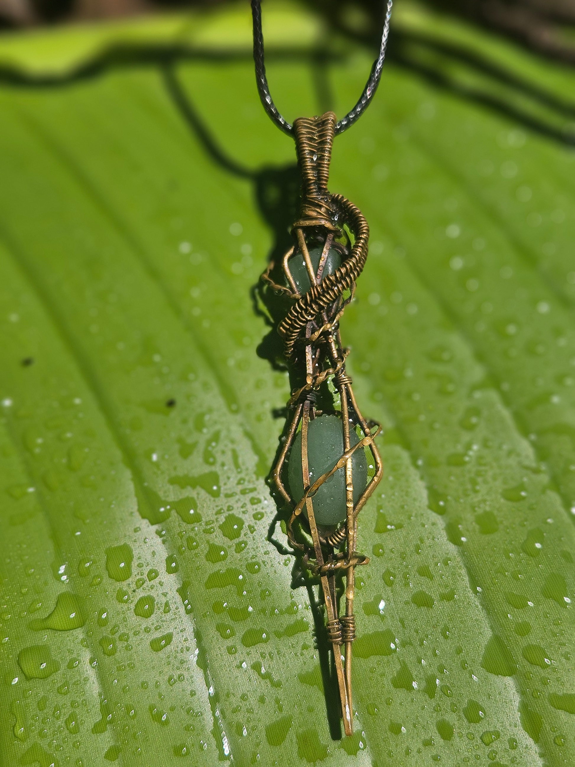 This enchanting pendant is handcrafted with warm, golden brass wire, wrapping a piece of soft green aventurine in a design that feels both ancient and alive. The intricate wirework coils and flows like vines, evoking the wild elegance of nature's own patterns.