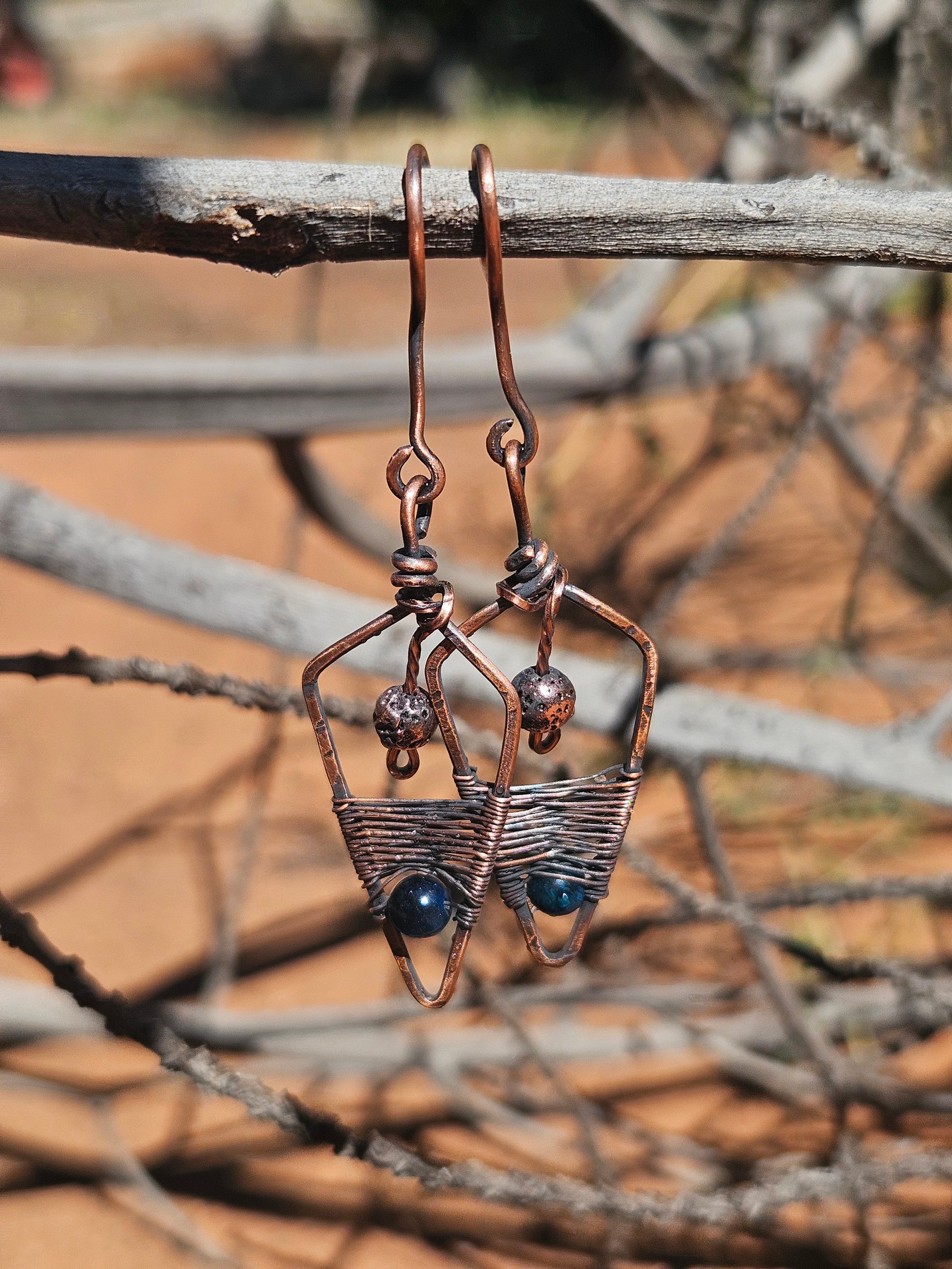 Infused with ancient charm and modern edge, these handcrafted earrings feature raw copper wire shaped into a unique geometric frame, wrapped delicately to cradle a deep blue Tiger Eye stone. Each piece is treated with patina for an antiqued finish, then sealed with varnish for lasting beauty.